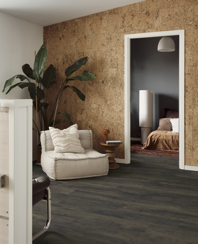 Panele posiadają strukturę imitującą naturalne drewno w układzie 1-lamelowym, co nadaje wnętrzu elegancki i ponadczasowy charakter. Czterostronna V-fuga dodatkowo podkreśla format desek i wzmacnia efekt realistycznej podłogi drewnianej.