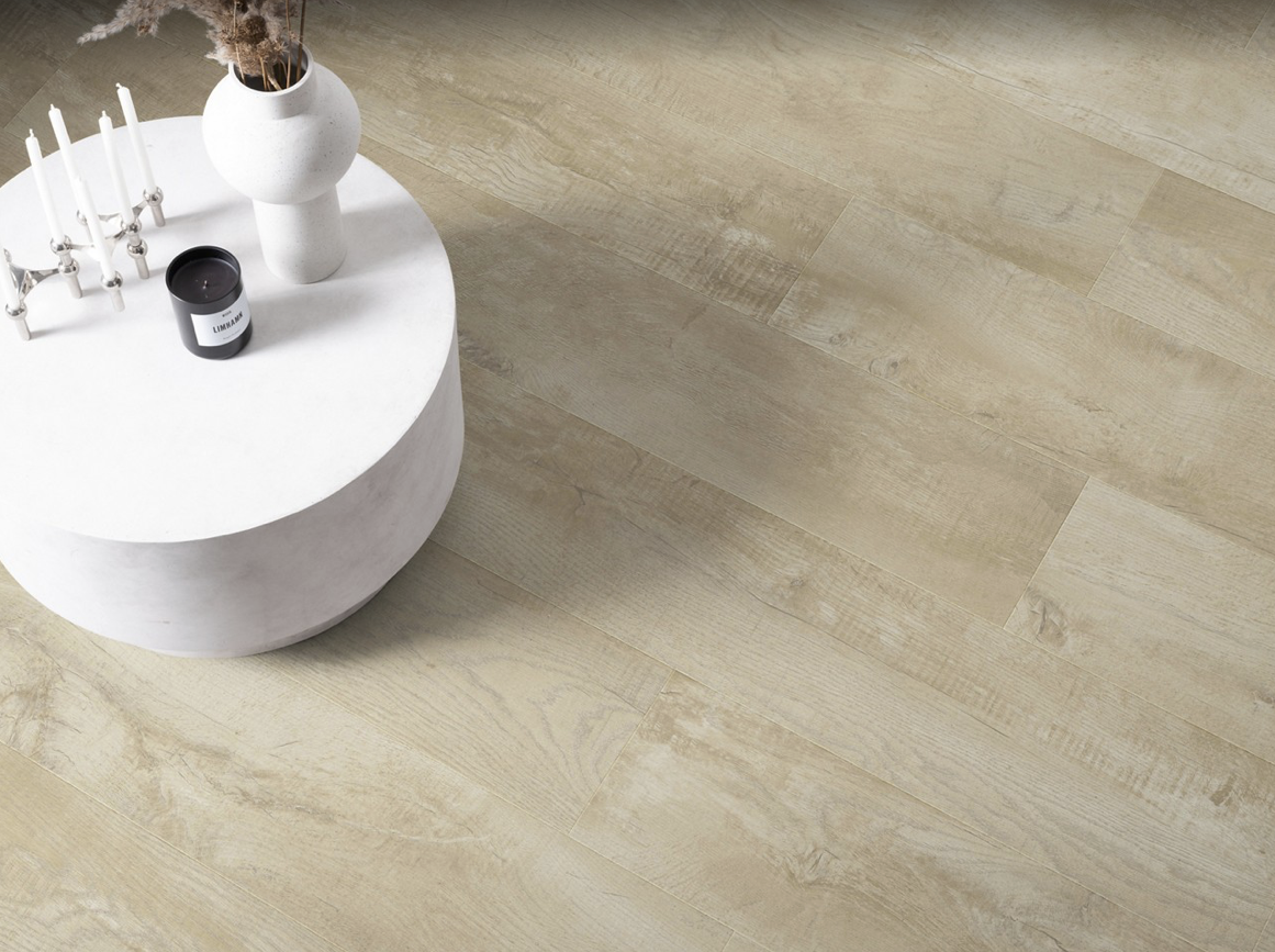 Panele posiadają strukturę imitującą naturalne drewno w układzie 1-lamelowym, co nadaje wnętrzu elegancki i ponadczasowy charakter. Czterostronna V-fuga dodatkowo podkreśla format desek i wzmacnia efekt realistycznej podłogi drewnianej.