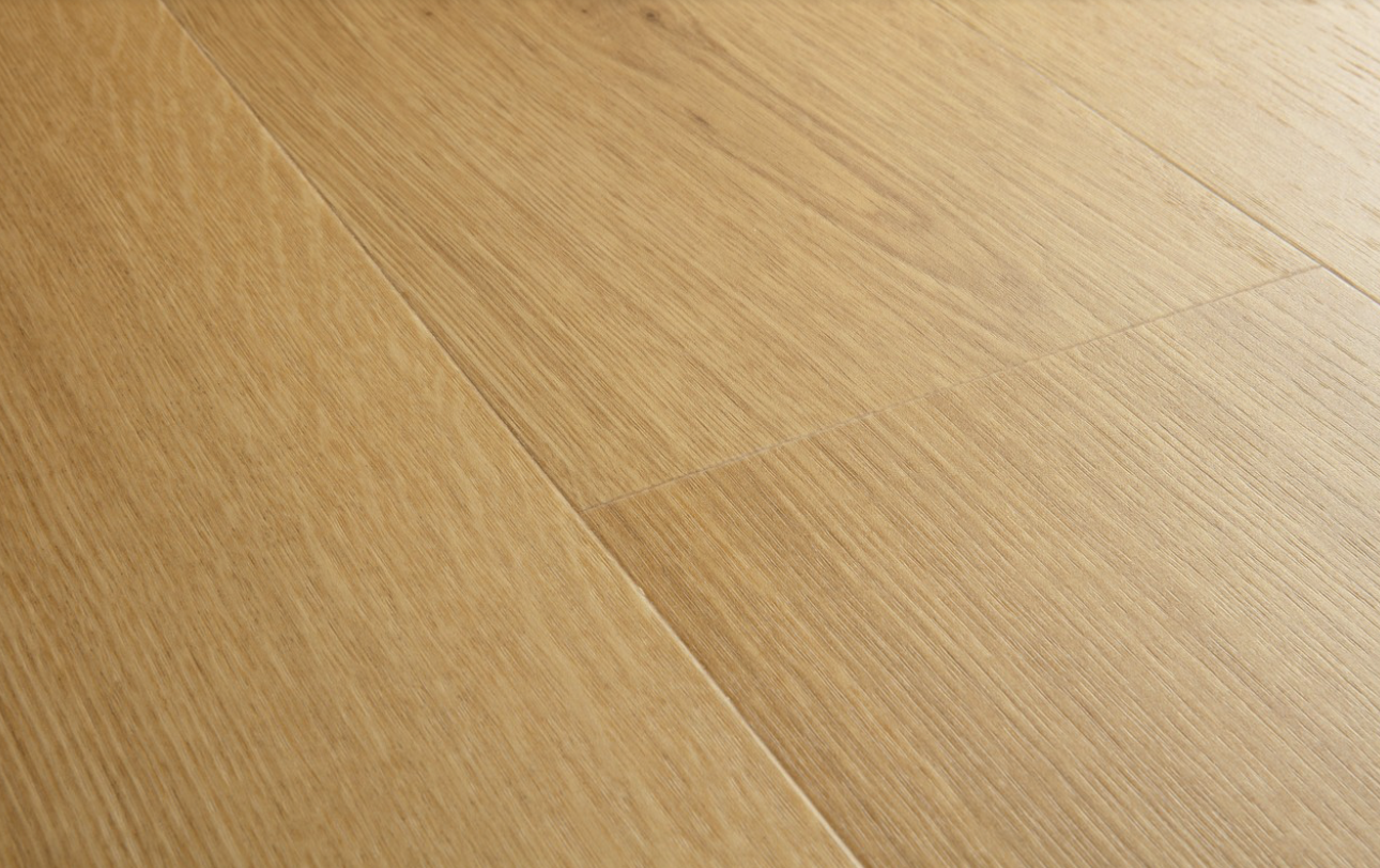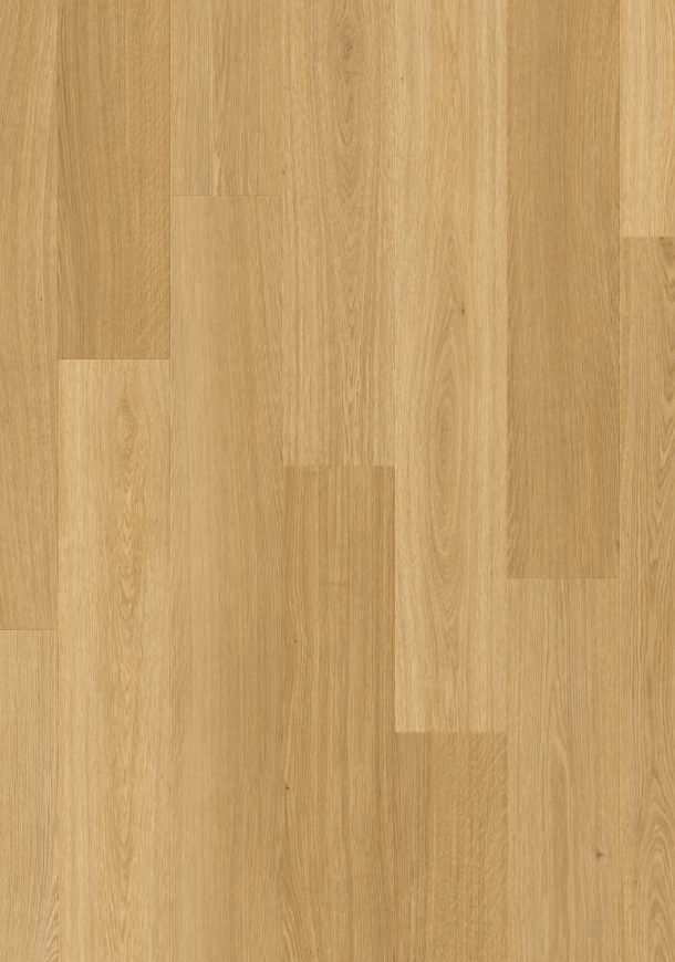 Panele posiadają strukturę imitującą naturalne drewno w układzie 1-lamelowym, co nadaje wnętrzu elegancki i ponadczasowy charakter. Czterostronna V-fuga dodatkowo podkreśla format desek i wzmacnia efekt realistycznej podłogi drewnianej.