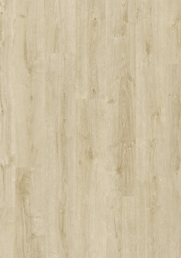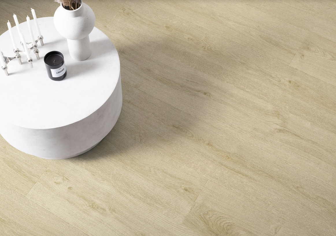 Panele posiadają strukturę imitującą naturalne drewno w układzie 1-lamelowym, co nadaje wnętrzu elegancki i ponadczasowy charakter. Czterostronna V-fuga dodatkowo podkreśla format desek i wzmacnia efekt realistycznej podłogi drewnianej.