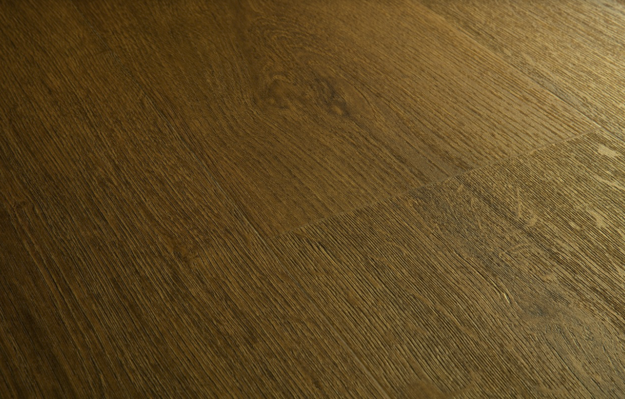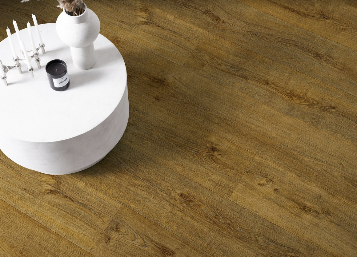 Panele posiadają strukturę imitującą naturalne drewno w układzie 1-lamelowym, co nadaje wnętrzu elegancki i ponadczasowy charakter. Czterostronna V-fuga dodatkowo podkreśla format desek i wzmacnia efekt realistycznej podłogi drewnianej.